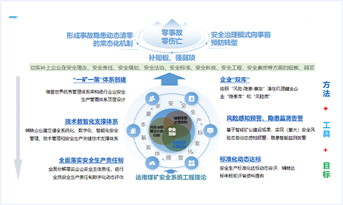 煤礦安全生產(chǎn)保障支撐體系是充分研究借鑒國際通用的安全管理體系架構(gòu),以國家法律法規(guī)、技術(shù)標(biāo)準(zhǔn)為基礎(chǔ),運(yùn)用煤礦安全系統(tǒng)工程理論,構(gòu)建以安全目標(biāo)為引領(lǐng),風(fēng)險(xiǎn)分級管控、隱患排查治理和風(fēng)險(xiǎn)防范化解三大機(jī)制構(gòu)建為核心,以安全生產(chǎn)標(biāo)準(zhǔn)化管理體系基本要求為主線,通過體系、雙庫建設(shè)的方式方法,借助安全、技術(shù)等數(shù)智化保障支撐工具,實(shí)現(xiàn)安全生產(chǎn)責(zé)任制全面落實(shí)、標(biāo)準(zhǔn)化動態(tài)達(dá)標(biāo)的目標(biāo)。切實(shí)補(bǔ)上煤礦在安全管理方面的短板、弱項(xiàng),最終實(shí)現(xiàn)“零事故、零傷亡”的宏偉目標(biāo)。